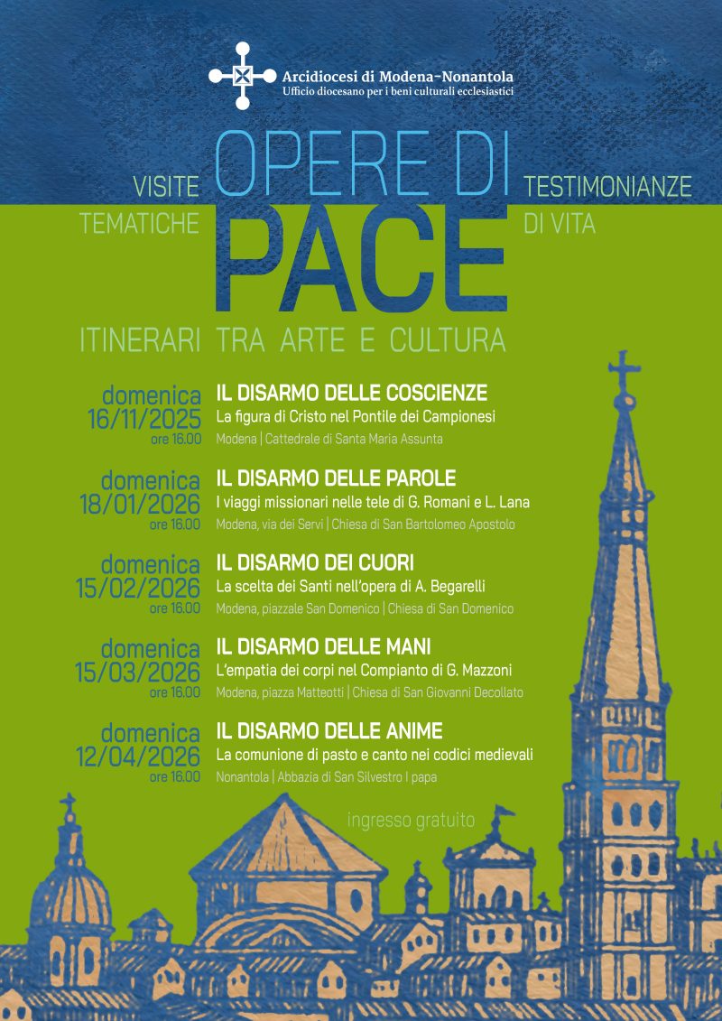 L’Ufficio diocesano per i beni culturali ecclesiastici di Modena-Nonantola desidera offrire in questo anno pastorale 2025-2026 un percorso culturale per approfondire la conoscenza del patrimonio artistico-spirituale del territorio. Attraverso la visita di alcune importanti chiese, grazie alla scoperta di un’opera d’arte significativa e all’ascolto di una testimonianza di vita si cercherà di mettere in risonanza il passato e il presente per scorgere come “Cristo è … Continua a leggere “Opere di pace. Itinerari tra arte e cultura” al via il 16 novembre