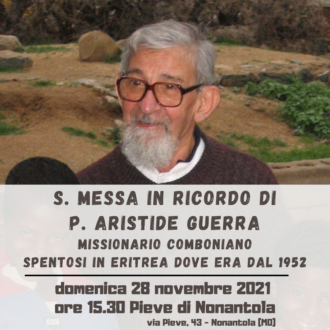Nella serata di lunedì 22 novembre, invece, è avvenuta la nascita al Cielo del sacerdote missionario comboniano Padre Aristide Guerra, nato a Nonantola nel 1927. Il funerale è stato celebrato in Eritrea, dove la sua salma è stata sepolta.