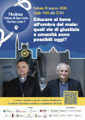 L’arcivescovo Erio Castellucci, vicepresidente della Conferenza episcopale italiana (Cei) aprirà i lavori del convegno intitolato “Educare al bene all’ombra del male – Quali vie di giustizia sono possibili oggi?”, che si terrà sabato 14 marzo 2026 presso la chiesa di San Carlo a Modena.