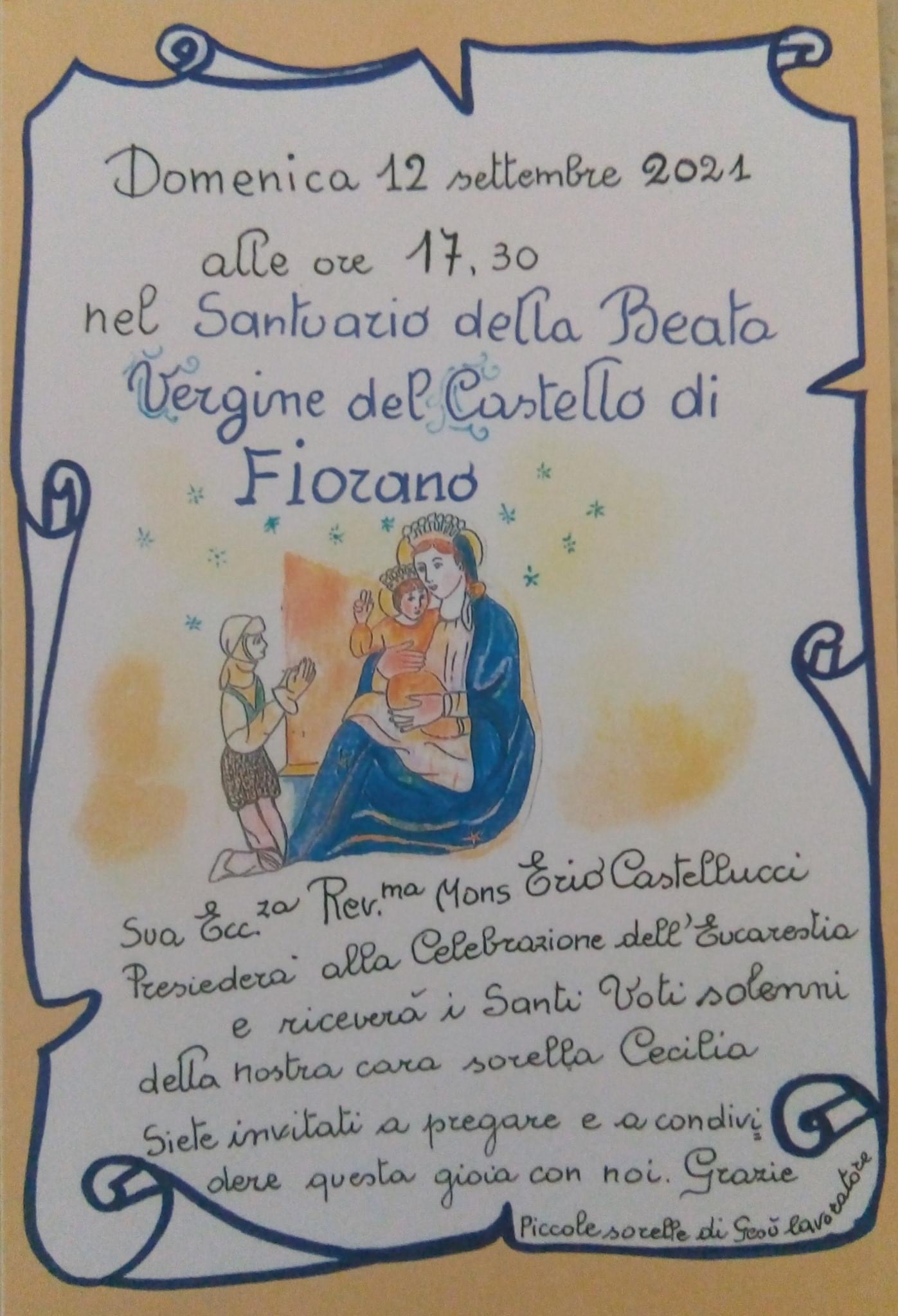 Domenica 12 settembre, alle ore 17.30, nel Santuario di Fiorano, l’Arcivescovo Mons. Erio Castellucci riceve i Santi Voti solenni di Cecilia Casali, giovane fioranese che ha scelto di entrare nella comunità modenese delle Piccole Sorelle di Gesù Lavoratore.