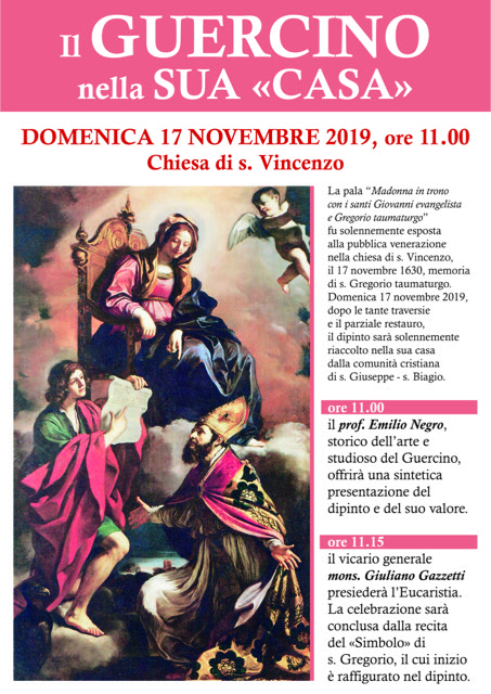 Anche in quella circostanza la data non fu determinata dalla semplice conclusione e disponibilità dell’opera, ma da una memoria liturgica poco nota nell’Occidente cristiano, la memoria di San Gregorio Taumaturgo, protagonista della scena rappresentata nella tela, assieme alla Vergine e a San Giovanni evangelista che regge una pergamena dove è riportato l’inizio del «Simbolo», ossia della professione di fede detta appunto «di San Gregorio». Fu lui a comporla dopo la visione notturna, rappresentata dal dipinto, in cui Maria Santissima e San Giovanni lo confermarono nella vera fede trinitaria: la consustanzialità del Padre, del Figlio e dello Spirito Santo. Sarà un giorno di grande festa per la nostra comunità, festa resa più solenne dall’eucaristia presieduta alle 11.15 da monsignor Giuliano Gazzetti, vicario generale, e preceduta da una breve presentazione del dipinto a cura del professor Emilio Negro, studioso del Guercino.