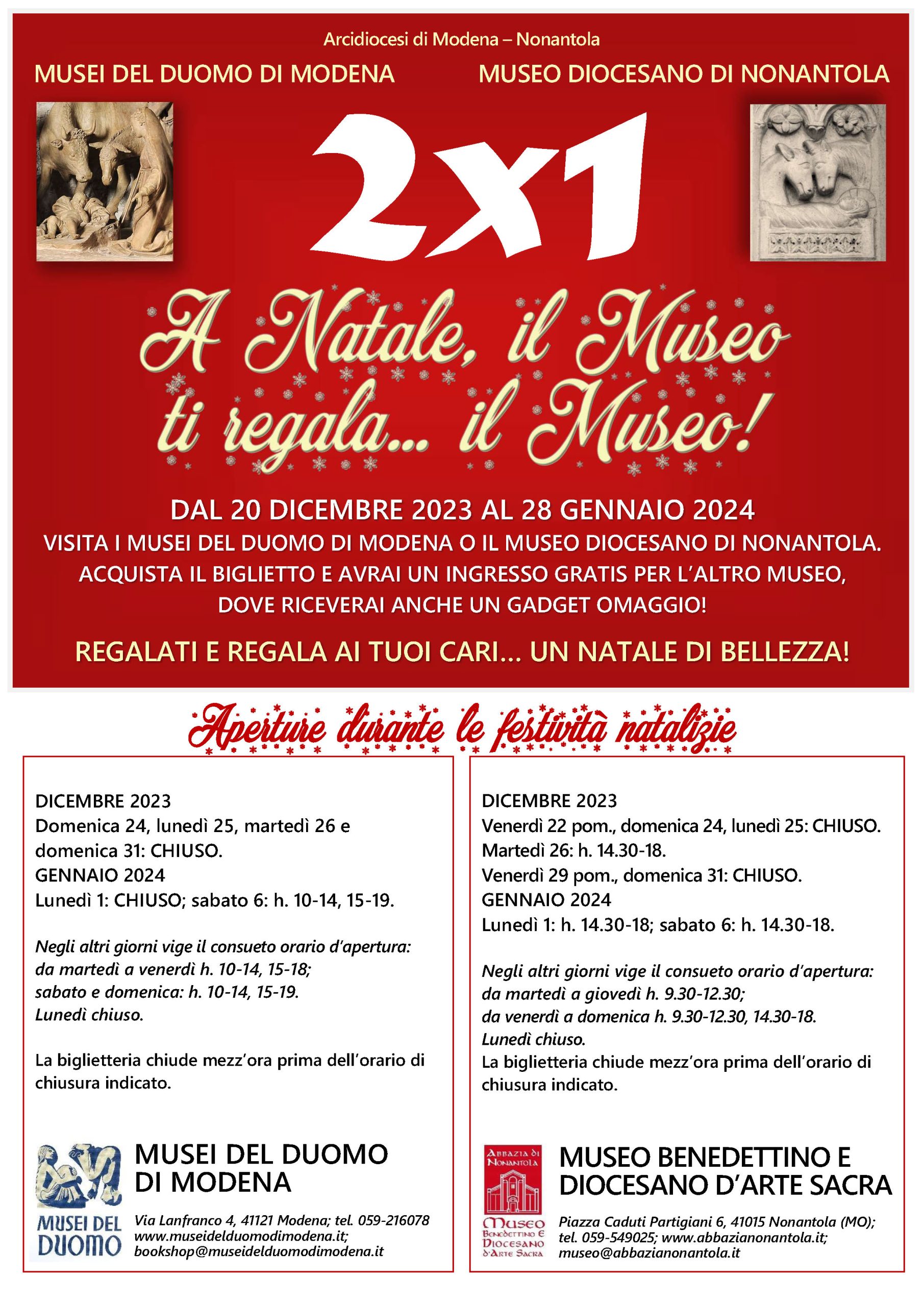 Torna quest’anno, in occasione delle feste natalizie, l’iniziativa nei Musei del Duomo e nel Museo benedettino e diocesano di Nonantola. A tutti coloro che visiteranno uno dei due Musei dal 20 dicembre dell’anno in corso al 28 gennaio 2024, pagando il regolare biglietto, verrà consegnato un coupon d’ingresso omaggio per il secondo Museo. Il coupon potrà essere consegnato alla biglietteria ed è valido per tutto il periodo dell’offerta. In questo modo, con un unico biglietto si potranno visitare entrambi i luoghi (anche in giornate diverse). Alla consegna del coupon sarà offerto anche un gadget.