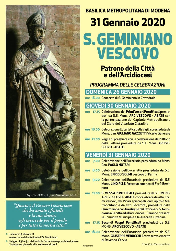 Venerdì, giorno della solennità, la celebrazione eucaristica delle 7 sarà presieduta da don Paolo Notari, mentre il Vescovo di Parma, Mons. Enrico Solmi, presiderà quella delle 8 e il Vescovo emerito di Forlì– Bertinoro, Mons. Lino Pizzi quella delle 9. Alle 11 sarà celebrata la solenne Messa pontificale, presieduta dall’Arcivescovo–Abate Erio Castellucci e concelebrata da altri vescovi, dai vicari episcopali, dal Capitolo metropolitano e da altri sacerdoti. La celebrazione, che vedrà la presenza delle autorità civili e militari, sarà preceduta dalla benedizione con la reliquia del braccio di San Geminiano alla città e all’Arcidiocesi. Dalle 14 alle 17 si potrà accedere in Duomo per la venerazione delle reliquie del santo patrono. Alle 17.15 saranno celebrati i secondi Vespri pontificali, presieduti dall’Arcivescovo-Abate. Il programma delle celbrazioni di san Geminiano si chiuderà alle 18 con la Messa vespertina, presieduta dall’Arcivescovo emerito di Ravenna–Cervia, Mons. Giuseppe Verucchi.