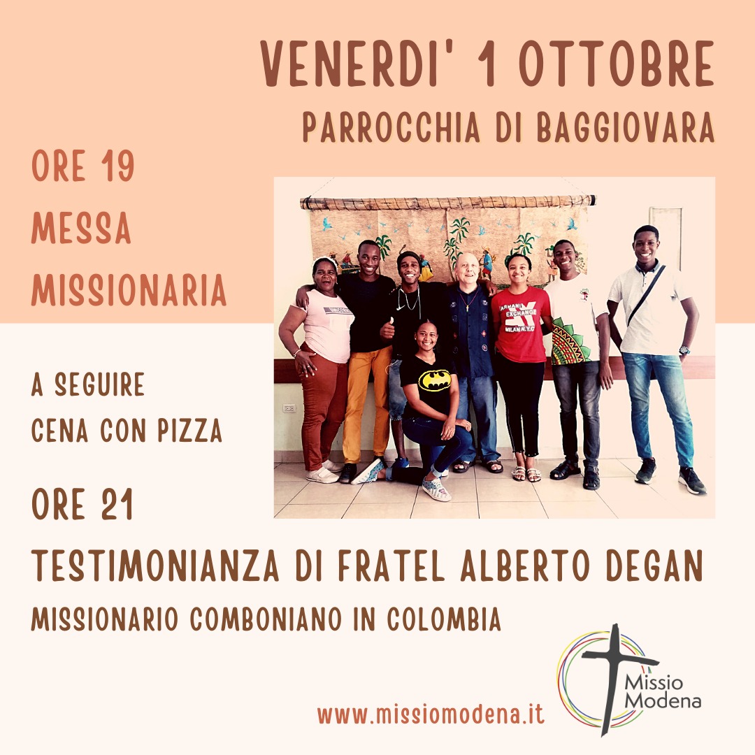 Dopo la celebrazione sono in programma una cena con pizza e, alle 21, l’incontro-testimonianza con fratel Alberto Degan, missionario comboniano in Ecuador.