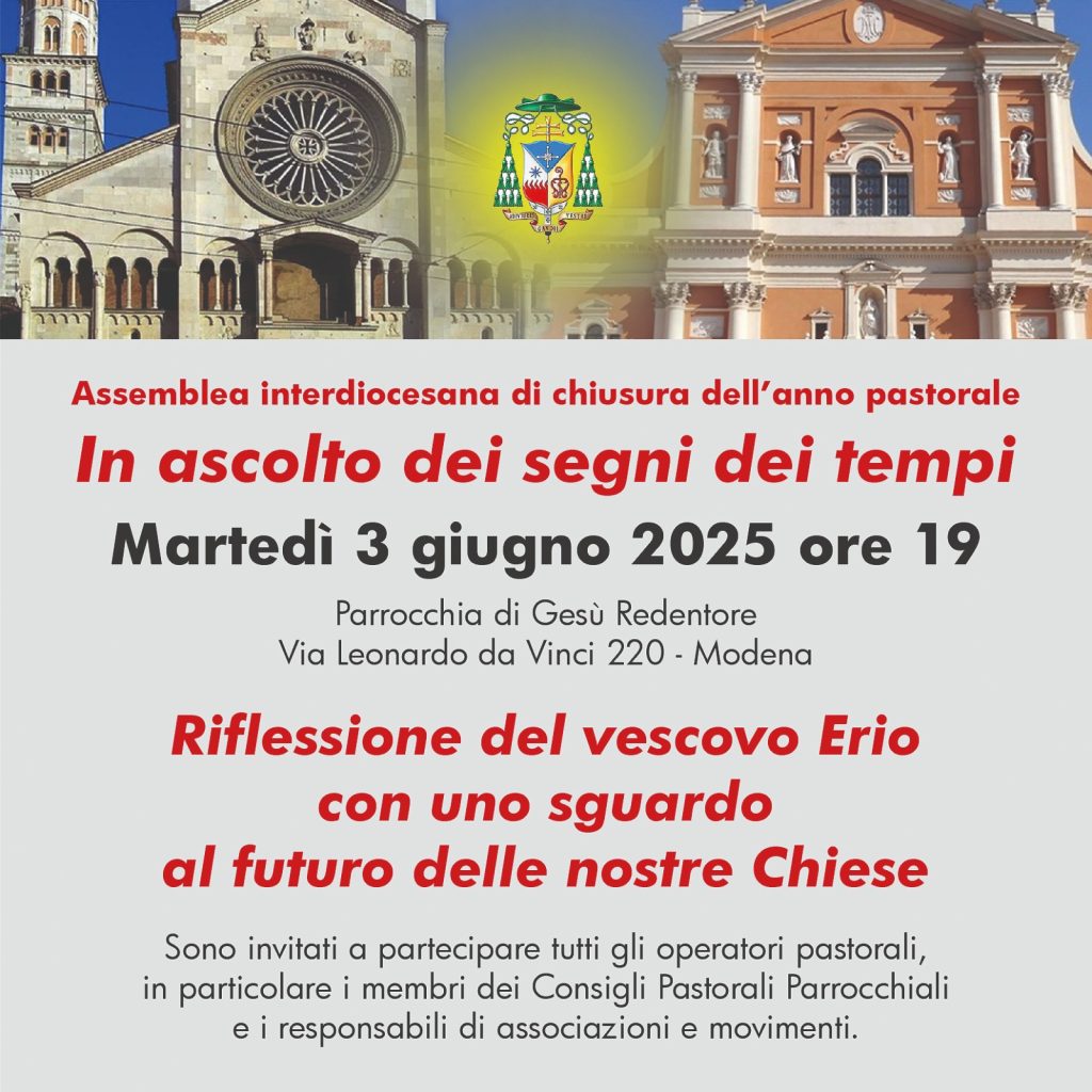 Agenda del Vescovo, Eventi in diocesi 27 Maggio 2025 Assemblea interdiocesana di chiusura dell’anno pastorale martedì 3 Giugno Descrizione: Inizio: 03/06/2025 19:00 Fine: 03/06/2025 21:00 Categorie: Agenda del Vescovo, Eventi in diocesi Indirizzo: Viale Leonardo da Vinci 220, 41126 Modena, Emilia-Romagna Italia Città: Modena Regione: Emilia-Romagna Paese: Italia Assemblea interdiocesana di chiusura dell'anno pastoraleViale Leonardo da Vinci 220, 41126 Modena, Emilia-Romagna Italia Assembela_interdiocesana_chiusura_anno_pastorale_03.06.2025