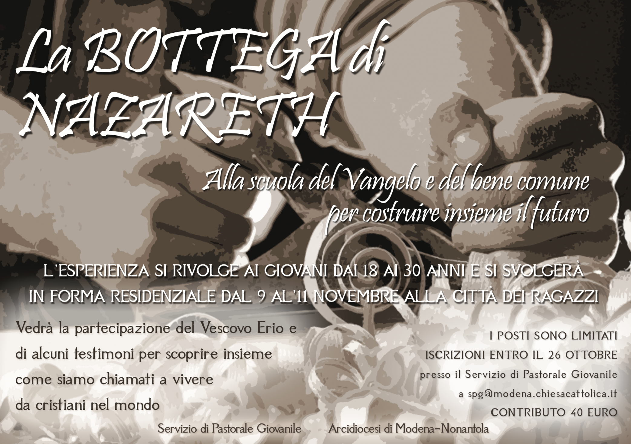 Agenda del Vescovo 31 Ottobre 2018 “Bottega di Nazareth” venerdì 9 Novembre Descrizione: Formazione Giovani Inizio: 09/11/2018 13:00 Fine: 11/11/2018 10:30 Categorie: Agenda del Vescovo Allegati: Scarica il volantino per la bottega di Nazareth Indirizzo: Citta' Dei Ragazzi Ente Diocesano Per La Salvezza E L'Educazione Della Gioventu', Via Tamburini Fortunato, Modena, MO, Italia Città: Modena Regione: Emilia-Romagna Paese: Italia "Bottega di Nazareth"Citta' Dei Ragazzi Ente Diocesano Per La Salvezza E L'Educazione Della Gioventu', Via Tamburini Fortunato, Modena, MO, Italia Scarica il volantino per la bottega di Nazareth