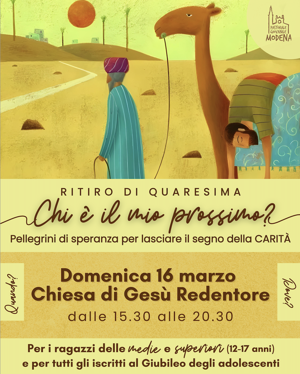 Agenda del Vescovo 9 Marzo 2025 Gesù Redentore: ritiro Quaresima adolescenti domenica 16 Marzo Descrizione: Inizio: 16/03/2025 15:30 Fine: 16/03/2025 17:00 Categorie: Agenda del Vescovo Indirizzo: Viale Leonardo da Vinci, 41128 Modena, Emilia-Romagna Italia Città: Modena Regione: Emilia-Romagna Paese: Italia Gesù Redentore: ritiro Quaresima adolescentiViale Leonardo da Vinci, 41128 Modena, Emilia-Romagna Italia chi e il mio prossimo